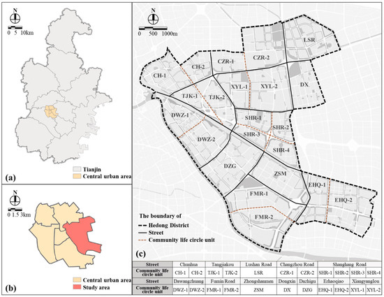 The geographic location and basic information of Hedong District. (a) Scope of Tianjin, (b) Scope of the central urban area of Tianjin, (c) Scope of the Hedong District of Tianjin.