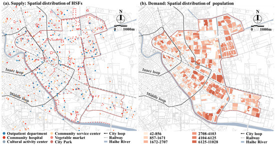 As urbanization continues globally, the urban population has surpassed 50% of the world’s total inhabitants, thereby making the health of urban residents crucial for global well-being [1,2]. Since the World Health Organization (WHO) first introduced the concept of “healthy cities” in 1984, the construction of healthy cities has gradually emerged as a vital strategy worldwide for addressing urban health challenges [3,4]. The disparities in facility resources and social spaces within urban environments are becoming increasingly pivotal determinants of human health and well-being [5]. As health service facilities (HSFs) serve as crucial resources for providing various health services to residents, they have been recognized as one of the key factors influencing the urban residents’ health in the “Integrating Health in Urban and Territorial Planning” released by WHO in 2020 [6]. In the “Healthy China 2030 Plan” released in 2016, the Chinese government explicitly advocated for ensuring the land needs of health-related public facilities and improving the relevant public infrastructure system. The HSFs, including urban parks, medical facilities, cultural activity centers, among others, have been proven to provide residents with access to nature [7,8], healthcare [9], promotion of social interaction [10], and physical activity [11], contributing to the health of urban residents. However, in the context of rapid urbanization, extensive development can lead to issues of inadequate supply and uneven distribution of urban health service resources, resulting in spatial justice concerns [12]. Therefore, the supply–demand levels and spatial equity of HSFs have garnered significant attention in urban research [13].