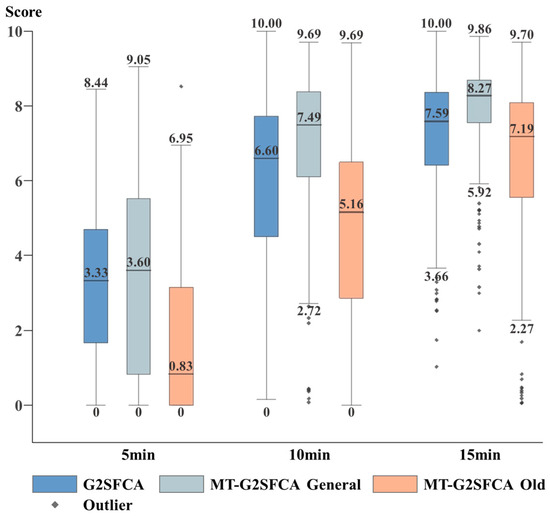 As shown in Figure 4, the accessibility of HSFs in the Hedong District gradually increases with the increase in walking time; when the walking time is 5 min, the median scores of the accessibility of HSFs calculated by both methods are below four points. Specifically, the median score for the elderly group is only 0.83. This indicates that the overall supply level of HSFs in residential quarters in the Hedong District, particularly in proximity to surrounding areas, needs improvement. When the walking time increases to 10 min, the median scores for the general age group calculated by both methods increase from 3.33 and 3.60 to 6.60 and 7.49, respectively. This indicates that under the threshold of 10 min, there has been a significant improvement in the health facility services available to most residents in the Hedong District. However, the median score for the elderly group is only 5.16, which remains at a relatively low level. When the walking time increases to 15 min, the median scores for all three categories of calculated results are above seven. This indicates that under the 15 min threshold, most residents in the Hedong District can enjoy satisfactory health facility services.
