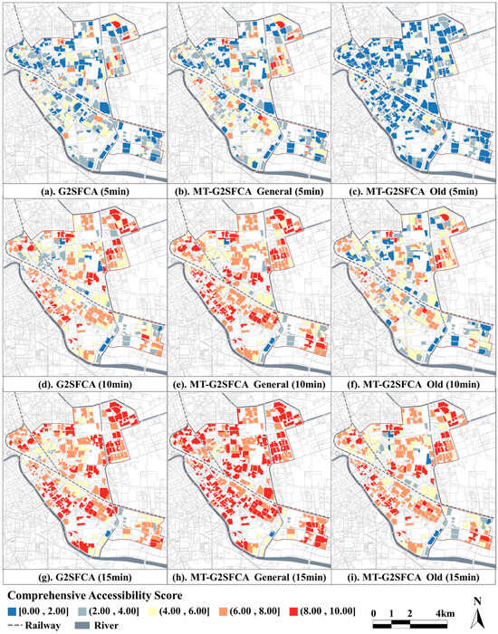 The accessibility of HSFs is calculated using both the G2SFCA and MT-G2SFCA methods under the walking time thresholds of 5 min, 10 min, and 15 min, as shown in Figure 4 and Figure 5. To compare the results of both methods, this study uniformly normalizes their computed values and divides their results into five categories according to the same criteria.