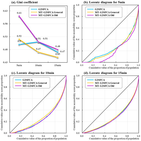 We calculated the Gini coefficients of comprehensive accessibility scores of HSFs under different walking time thresholds using G2SFCA and MT-G2SFCA, respectively. Subsequently, we depicted Lorenz curves based on these calculations. As observed in Figure 6, the spatial equity of the comprehensive accessibility scores of HSFs in the Hedong District generally gradually improves as walking time increases. As the walking time increases from 5 min to 15 min, the equity level of the Gini coefficient in the three scenarios improves from “wide gap” to “large gap” but remains at a low level.