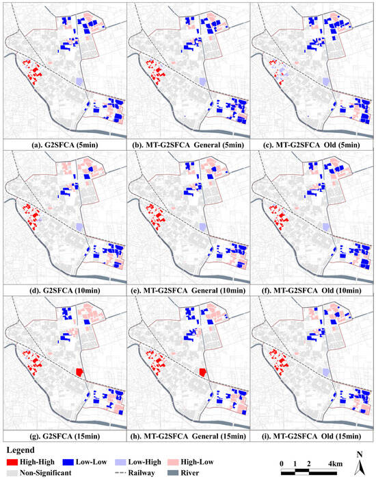 In addition, the calculation results of the two methods show good consistency under different walking time thresholds, which verifies the effectiveness of MT-G2SFCA. Comparing the computational outcomes of two age groups reveals that when the pedestrian time is 5 min, the number of HH class clusters among the elderly demographic is significantly lower than that of the general group. With an increase in pedestrian time, this situation exhibits some improvement, but it still underscores the spatial inequity challenges faced by the elderly compared to younger adults.