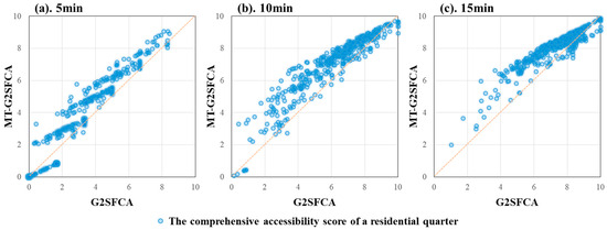 The scatter plot of calculated scores of G2SFCA and MT-G2SFCA.