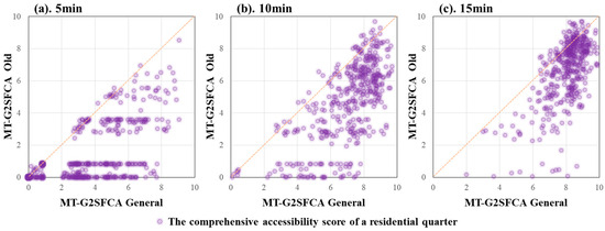 Previous studies on facility accessibility and equity have primarily targeted single types of HSFs such as hospitals, parks, and nursing homes, with limited comprehensive assessments of multi-type facilities [74]. Previous studies often selected facility scale as a representation of its supply capacity, while neglecting the importance of the diversity of facility types for residents’ health. The diversifying health service demands of the residents have rendered the accessibility evaluation research of a single type of HSFs inadequate in objectively and comprehensively reflecting the overall service capacity of the facility resources. Therefore, this study proposes an MT-G2SFCA method integrating the scale accessibility and type diversity, aiming to improve the precision of comprehensive accessibility evaluation for multi-type HSFs. To examine the differences between the traditional G2SFCA and the improved MT-G2SFCA, this study plotted scatter diagrams of the calculation results of the two methods (Figure 9). As shown in the figure, the scores of G2SFCA are generally lower than those of MT-G2SFCA. As the score increases, the underestimation trend generally exhibits a characteristic of first rising and then falling back. This shows that the underestimation of facility accessibility by G2SFCA is more pronounced in regions with medium levels. The reason for the underestimation is that it only takes the facility scale as the standard one-sidedly, while ignoring the enhanced health service benefits brought about by the diverse and abundant facility types.
