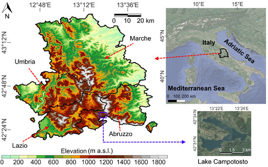 The study region is in Central Italy, which includes parts of Apennines and four Italian administrative regions (Abruzzo, Lazio, Marche, and Umbria) affected by the Amatrice–Norcia–Campotosto seismic sequence (Figure 1). The elevation in Central Italy ranges from zero to a maximum of about 3000 m a.s.l., with the lowest toward the Adriatic Sea and the highest toward its center, i.e., Apennines (Gran Sasso and Monte Vettore). The temperature of this region can be classified as cool (Apennines), sub-continental, and sub-coastal (toward the Adriatic Sea) [31]. The minimum and maximum amounts of monthly accumulated precipitation are roughly in July and November for all four regions, respectively [32]. The median values of the monthly accumulated precipitation in July and November are estimated as 40 mm and 110 mm for Abruzzo, 30 mm and 130 mm for Lazio, 40 mm and 90 mm for Marche, and 30 mm and 110 mm for Umbria, respectively [32] Grasslands, grassy woodlands, and deciduous broadleaf forests are the main land covers of this region [30].