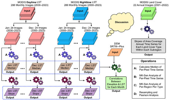 The rest of this work is organized as follows. Section 2 describes the study region, the MODIS products employed herein, and the MK–Sen and Pearson analyses. Section 3 demonstrates the results, including the daytime and nighttime LST monthly maps and their trend maps, and land cover maps and their trend analyses. This section also presents the correlation results between the elevation and the LST. The relationships between the elevation, LST, and land cover are discussed in light of other similar studies in Section 4. Section 5 concludes this article.