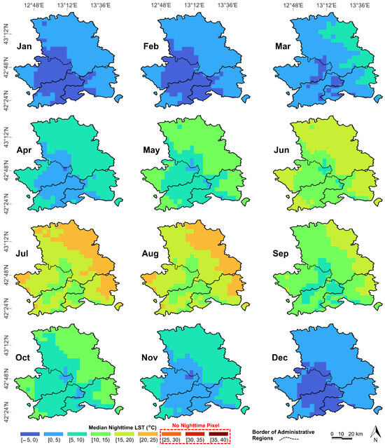 From the figures, a negative daytime and nighttime LST during the winter (December, January and February) can be observed in the high altitude areas of the Apennines. The median nighttime LST does not exceed 25 °C in all twelve months (see Figure 4). On the other hand, the median daytime LST reaches 40 °C during the summer, mainly in Marche near the coast with low altitudes (see Figure 3).