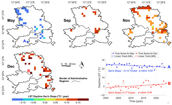 LST daytime spatial maps of Sen’s slopes for the calendar months at a 95% confidence level.