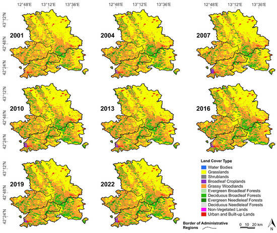 To visualize how the land cover types have been changing in the study region, the MODIS annual land cover images for the years 2001, 2004, 2007, 2010, 2013, 2016, 2019, and 2022 are first illustrated in Figure 7.