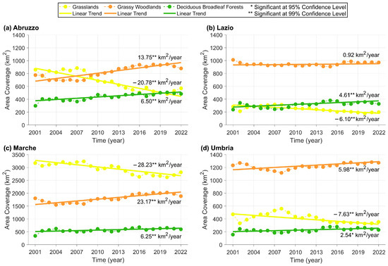 The land cover change is estimated by MK–Sen for the three main land cover types, and the results are illustrated in Figure 8. Each annual time series, shown in Figure 8, is obtained by counting the number of pixels classified as a particular land cover type within each subregion for each calendar year, multiplied by 0.25 km2 (the approximate area of each pixel). The size of each time series is 22, i.e., one observation for each year from 2001 to 2023. It is clear from Figure 8 that grasslands have been decreasing, while woodlands and forests have been significantly expanding within each subregion. In fact, the grasslands have been replaced mainly by woodlands and forests. Afforestation or forest expansion in the Central Apennines, partially due to anthropogenic activities, has been occurring in recent decades, and has been studied in the literature [41,42].