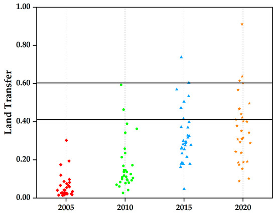 The core explanatory variable selected in this paper is farmland transfer (Transfer), expressed as the ratio of the area of cultivated land transferred under a family contract to the total cultivated land area under a family contract [71,72].