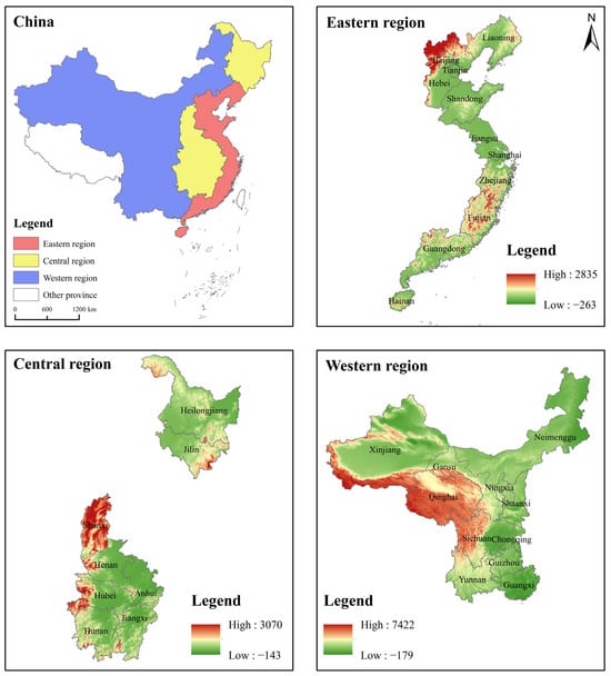 Considering the availability of data, the study area of this paper includes 30 provinces, autonomous regions, and municipalities directly under the central government in China (excluding Tibet, Hong Kong, Macao and Taiwan). At the same time, the study area was divided into the eastern, central and western regions, based on the National Statistical Office’s classification of the “three regions”. An overall overview of the study area is shown in Figure 1. The eastern region is situated on the coast, with gentle terrain, relatively obvious transport, market, economic and labour advantages, strong technological capabilities and relatively high agricultural labour and land productivity. Agricultural development trends in the eastern region are moving in the direction of a modern, efficient and export-oriented agricultural model. The central region, with its plateau in the north, hills in the south and numerous plains, has favourable conditions for agricultural production and natural resources, and is China’s main production base for agricultural products, known as China’s “breadbasket”. Agricultural development in the central region has insisted on ensuring that the area under food cultivation and production remain stable, promoting the construction of functional food production zones, protected areas for important agricultural products, and zones of superiority for special agricultural products. The western region is vast, with complex terrain and diverse climates, and the overall farming efficiency is lower than in the central and eastern regions. The western region relies on the region’s unique agricultural resource advantages to develop speciality agriculture and form a modern agricultural development model with speciality products.