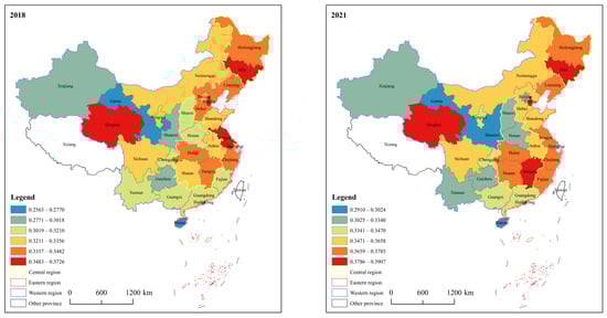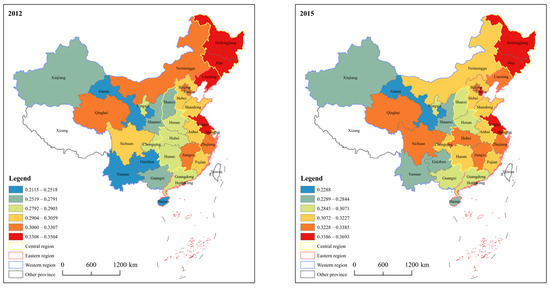 In this study, the entropy weight method is used to measure the national agricultural sustainable development index from 2012 to 2021. It is shown in Figure 2: From the point of view of spatial distribution, over time, China’s agricultural sustainable development index has always shown the spatial distribution characteristics of high in the east and low in the west. In 2012, Heilongjiang, Jilin, Liaoning and Jiangsu were in the first tier, with high levels of sustainable agricultural development; Hainan, Gansu, Guizhou and Yunnan were in the sixth echelon, and their level of sustainable agricultural development is low. In 2021, the layout of the level of sustainable agricultural development changes, with Jilin, Tianjin, Jiangxi, and Qinghai in the first tier, and Hainan, Gansu, and Shaanxi in the sixth tier. In terms of the distribution of the three major regions, all the provinces in the eastern region are in the top three echelons, except for four provinces, namely Beijing, Shanghai, Guangdong and Hainan; The central region is in the top three echelons, with the exception of two provinces, Shanxi and Henan; in contrast, the development of the western region is more uneven, and the distribution of the level of sustainable agricultural development among the provinces in the region is more dispersed, but still improved compared with 2012.