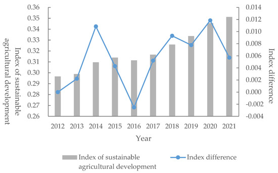 China’s agricultural sustainability index and the difference in changes by year.