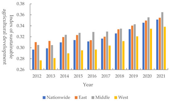 The trends in the national and three major regional agricultural sustainability indices from 2012 to 2021 are shown in Figure 4. From the point of view of the time change trend, the bar charts as a whole all show an upward trend, indicating that the level of sustainable development of agriculture at the national level and in the three major regions has increased to a greater extent during the sample period.