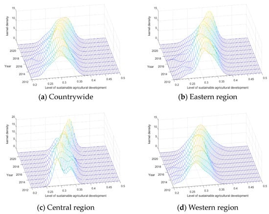 Using the kernel density estimation method, the dynamic evolution characteristics of the level of sustainable agricultural development in China and the three major regions were analysed separately. The results are shown in Figure 3.
