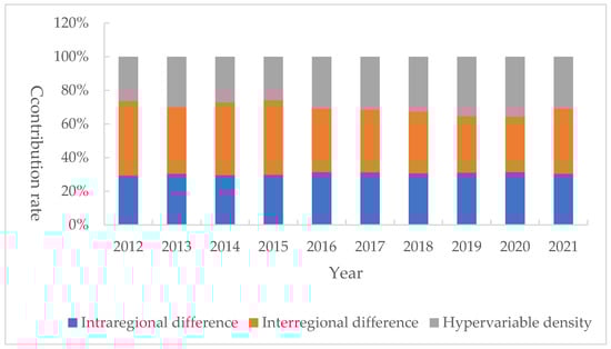 With regard to regional variations, the national, intraregional and interregional variations show a downward trend. The intraregional differences are, in descending order, between the western, central and eastern regions. The interregional differences are, in descending order, central–west, east–west, and east–central. In terms of variance contribution, interregional variance contributes the most, followed by intraregional variance, and hypervariable density. The combination of changes in regional variances and variance contributions leads to the conclusion that national and intra- and interregional variances have decreased, but interregional variances are still the first source of overall variance.