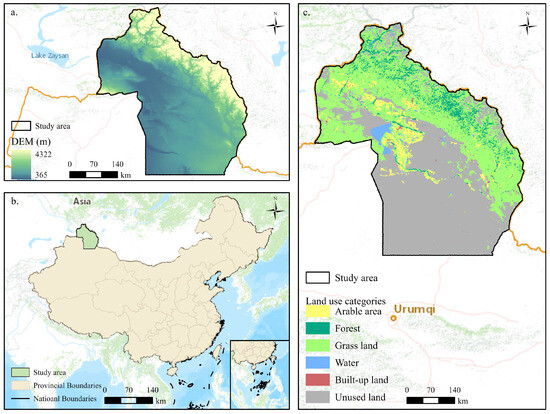 Location of the Altay region in China. (a) Elevation distribution; (b) map inspection number GS (2019) 1822; (c) land-use categories of Altay in 2020.