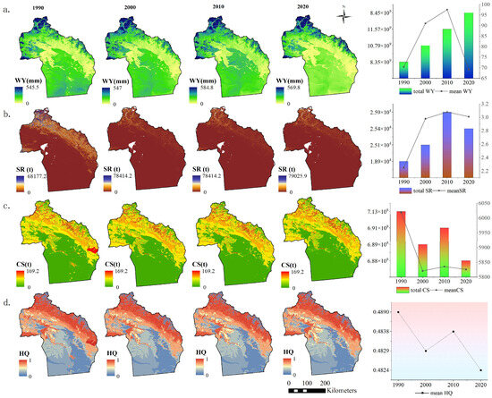 Spatial–temporal patterns and variability in ecosystem services. (a) WY: water yield; (b) SR: soil retention; (c) CS: carbon stock; (d) HQ: habitat quality.