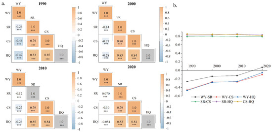 (a) Trade-offs and synergies amongthe relationships of ecosystem services in the Altay region from 1900 to 2020; (b) Correlation changes in 1990 to 2020. *** p < 0.001.