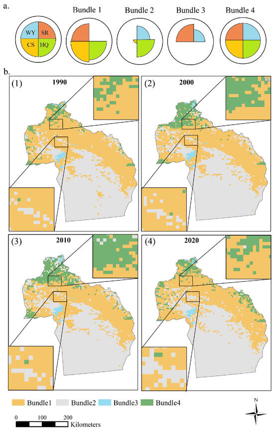 Figure 5 reflects the shift in area of different ESBs at the grid scale and the proportion of landscape types from 1990 to 2020. Over the past 30 years, the change in the area covered by Bundle 1 has exhibited a consistent pattern with the change in the area of forests within its corresponding landscape type. Bundle 2 exhibits the highest proportion of unused land in the regional landscape type, which is primarily composed of bare rock and sandy soil. The Gobi encompasses a considerable area of undeveloped wasteland, resulting in a lower proportion of soil retention in this bundle. The landscape composition of bundle 3 is dominated by river, which accounts for more than 50% of the area. Bundle 4 exhibits the greatest proportion of forested grassland in comparison with the other three ESB landscape types, displaying an upward and subsequent downward trend in the change in its area.