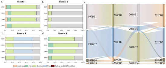 From 1990 to 2000, the land use type of the region where bundle 1 is located exhibited a higher proportion of forests and grasslands. Concurrently, the area occupied by bundle 1 decreased by 11.6% due to an increase in the proportion of unused land. In contrast, the area of bundle 4 exhibited an increasing trend, accompanied by an increase in the proportion of forests in the landscape type and a concomitant decrease in the proportion of unused land. The reduction in bundle 1 was accompanied by an increase in the areas of bundle 2 and bundle 4 (Figure 5e). The area covered by bundle 1 showed an increasing trend from 2010 to 2020, which was reflected in a decrease in the share of cropland and an increase in the share of forests in its land use type. The area covered by bundle 4 was the highest in 2010, with an area share of 9.7%. This was mainly due to an increase in the proportion of grassland, a continuous decrease in the proportion of unused land, and an increase in vegetation cover. The proportion of area covered by bundle 2 was 51.1% in 2020, with the proportion of arable land showing an increasing trend and the proportion of unused land showing a decreasing trend.