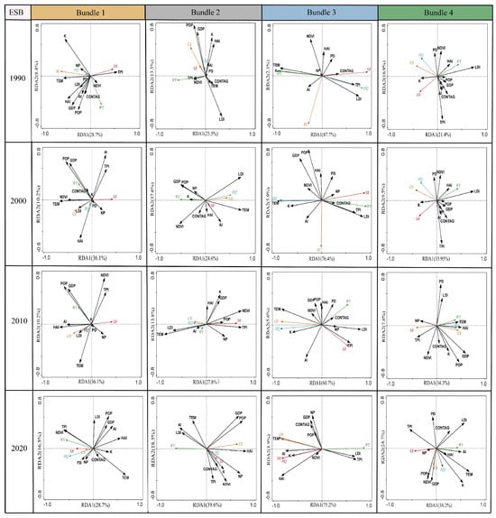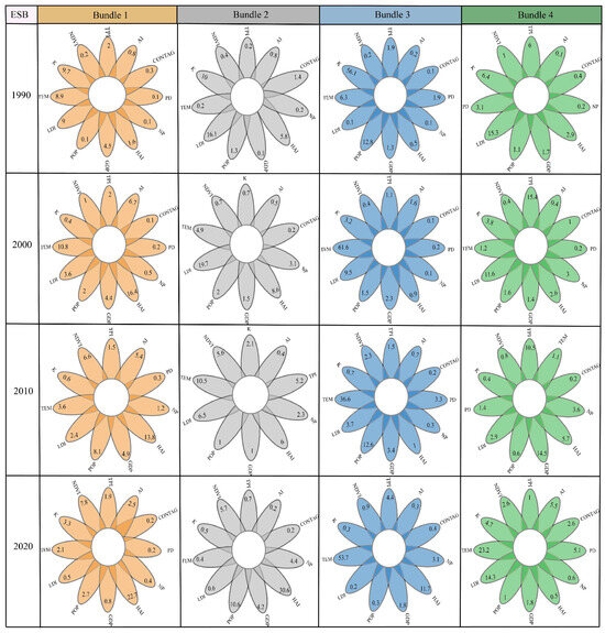 During 1990–2000, the main drivers affecting the changes in bundle 1 and bundle 3 were K and TEM, respectively. The contribution of K demonstrated an upward trajectory, while the explanatory potential of NP and PD was less than 2%. The spatio-temporal drivers of bundle 2 were mainly K and LDI. In this case, the influence of K exhibited a decreasing trend, while the influence of LDI gradually increased. The key drivers affecting changes in bundle 4 were TPI and LDI, with the influence of TPI increasing significantly and a contribution rate of 15.4% in 2000. From 2010 to 2020, the main drivers affecting bundle 1 were HAI and NDVI. The effect of these drivers gradually increased. For bundle 2, in addition to LDI, the HAI driver has become one of the key drivers. For bundle 3, the social driver POP became a key driver in 2010, along with the impact of the ecological driver. However, the social driver of this cluster changed from population density to HAI in 2020. For bundle 4, the social driver was replaced by GDP from the previous LDI, and the impact of the social driver exceeded the impact of the ecological driver, contributing 23.2% in 2020.