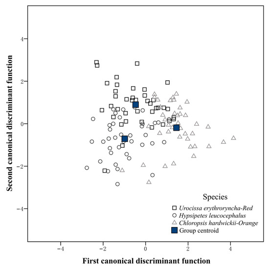 The results of the stepwise discriminant analysis of habitat characteristics for the three bird species demonstrated that the model had good discriminant ability (Table 6), with the correct classification rate of the discriminant model at 74.17%. The model significantly differentiated the habitat selection and utilization of the Red-billed Blue Magpie, Black Bulbul, and Orange-bellied Leafbird (p < 0.01). The Wilks’ Lambda value decreased progressively from 0.763 to 0.322, and the F value was much greater than 1, indicating that these eight key discriminant factors contributed significantly to the discriminant analysis. Among them, the discriminant function coefficient for coverage above the perch had the largest absolute value, showing the strongest discriminant ability for differentiating the three bird species. The first two discriminant functions were used to create a discriminant classification diagram (Figure 2), which, overall, shows a clear distinction in habitat feature preferences among the three bird species, reflecting differences in habitat selection and utilization among them within the yew ecological garden.