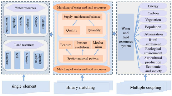The study of the mutual matching of water and land resources is carried out from two perspectives: the balance between supply and demand of water and land resources and the matching of spatial and temporal patterns. The supply–demand balance relationship focuses on the quantity and quality of water and land resources; the spatio-temporal pattern matching is mainly based on quantitative analysis, which is divided into three aspects: matching characteristic division, pattern evolution research, and driving factor analysis. The study of multiple coupling between water and land resources system and other systems pursues the unification of ecological, economic, and social benefits, and karst mountainous areas are more involved in the aspects of the water and land resources and ecological environment system, water and land resources and agricultural production system, and water and land resources and socio-economic development.