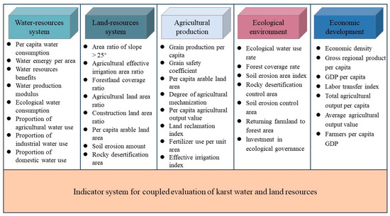 With the depletion of Earth’s resources and the continuous deterioration of the ecological environment, people’s understanding of the coupling of water and land resources is no longer limited to simple water–land relationships. Gradually, attention has turned to the interaction patterns and coupling relationships between external systems and water–land resource systems [93]. The optimization of water and land resources involves not only two natural resources but also a complex system composed of economics, society, ecology, environment, resources, and population. Especially after the implementation of sustainable development strategies, the demand for water and land resource allocation is increasing, pursuing the unity of ecological, economic, and social benefits [71]. Water and land resources matching, as well as how various systems based on water and land resources can achieve sustainable development, has become a new research focus. These systems include water and land resources and energy [94], water and land resources and agricultural production [95], water and land resources and socio-economics [96], water and land resources and carbon [97], water and land resources and vegetation [98], water and land resources and population [99], water and land resources and urbanization [100], water and land resources and rural settlements [101], water and land resources and ecological environment [102], and so on. Current research mainly focuses on quantitative evaluation, constructing evaluation indicator systems from aspects such as water resource utilization subsystems, land resource utilization subsystems, ecological environment subsystems, and socio-economic development subsystems. Research in the karst mountain area currently focuses more on aspects such as water and land resources and the ecological environment, water and land resources and agricultural production, and water and land resources and socio-economic development, with relatively less emphasis on coupling studies with other systems such as carbon and heat resources [103]. In terms of indicator selection, compared to other non-karst mountain areas, the karst mountain areas highlight indicators such as rocky desertification and soil erosion (Figure 5) [104]. In the exploration of the mutual matching of water and land resources systems with other systems, the coupling coordination model is widely used, such as using the coupling coordination model to explore the coupling coordination status, regulation mechanisms, and coordination degree of the three systems of water and land resources utilization and the ecological environment. Although the coupling coordination method has been proven to be useful, the interaction between water and land resources systems and other systems involves natural processes and human activities, considering the intricate relationships between all resources involved in this process. Therefore, a multi-objective optimization model for sustainable management has been proposed [105,106].