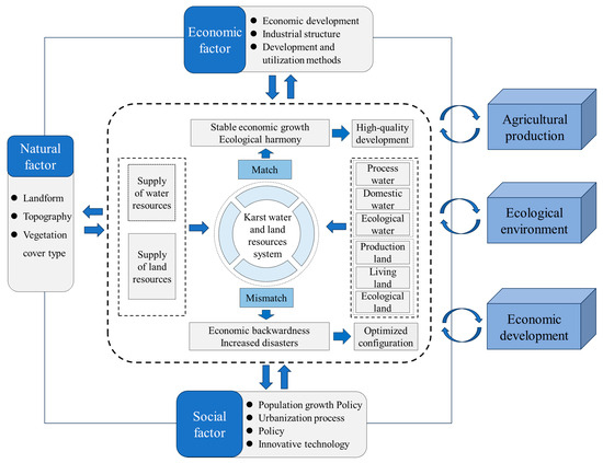 The endowment of water and land resources is coupled with the sustainable development of regional economy. Karst areas are relatively prone to natural disasters and have difficulties in development and utilization; thus, agricultural economic development is difficult, and rural poverty alleviation pressure is high [55]. With the development of the economy and society and the increase in the material demands of the people, the contradiction between supply and demand of agricultural water and land resources continues to intensify. For example, the implementation of various production and construction projects threatens the quantity of arable land resources, while the sharp increase in industrial and domestic water demand also leads to continuous exploitation of water resources [21]. In addition, the allocation of factors such as funds, policies, technology, and labor directly determine the development direction of the economy and society in karst areas, thereby affecting the development and utilization of water and land resources.