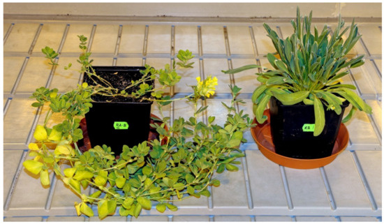 Different growth of Rhinanthus major plants attached to roots of two legume species, Lotus maritimus (on the left) and Anthyllis vulneraria subsp. maritima (on the right).