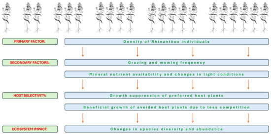 Host selectivity of Rhinanthus species, described in Section 4, seems to be the main mechanism leading to changes in species diversity in grasslands. The existence of selectivity has been proven also in experiments in controlled conditions even among taxonomically related host species, such as within grasses or legumes [20]. Most importantly, growth of more-preferred hosts (as indicated by a larger number of haustorial contacts in host roots) were more depressed in comparison to that of less-preferred hosts, and this effect was especially pronounced in conditions of low soil nutrient availability [20]. Moreover, parasitism by R. minor also changed the relative competitive ability of grass species cultivated in binary mixtures. Consequently, plant species interactions in grasslands are significantly affected by the presence of hemiparasitic plants in a similar manner to that of herbivores and pathogens. Spatial theoretical modelling has been used to predict an outcome of competitive interactions involving R. minor, and it was demonstrated that nutrient availability is one of the major factors determining the outcome [83]. The complex dynamics of interactions resulting in unpredictable shifts in vegetation structure might be associated with formation of locally unstable parasite populations, where even relatively small quantitative changes can result in significant qualitatively different outcomes. Thus, alternation between parasite-rich and parasite-poor phases can result from the fact that when the parasite suppresses growth of high quality host plants, the shortage of preferred host plants will become a limiting factor for parasite abundance [83]. Interaction between the main factors leading to changes in grassland biodiversity by the presence of Rhinanthus species is shown in Figure 4.