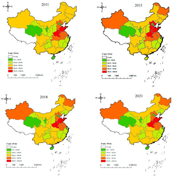 In terms of spatial distribution, significant regional differences exist in the geographical pattern of agricultural carbon emissions in China. These emissions exhibit a distinct trend of being higher in the east and lower in the west, as well as higher in the north compared to the south. More specifically, regions with high and medium agricultural carbon emissions are predominantly located in the central, eastern, and northern parts of the country, whereas low-emitting regions are concentrated mainly in the west and south. The reason for this may refer to the fact that the climate conditions, soil characteristics, and agricultural structure in the central and eastern regions of China are shown to be more suitable, agricultural production is more intensive, and the development foundation is better, resulting in higher agricultural carbon emissions and the formation of carbon emission aggregation areas.