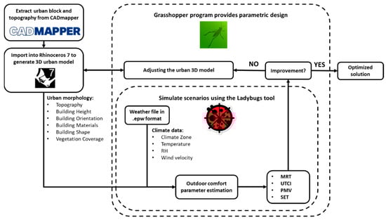 In this study, the combination of Rhinoceros Version 7 SR37 (7.37.24107.1500) and Grasshopper (Version 1.0.0007) with Ladybugs plugin was used, as the software allowed flexibility in adapting multiple formats of 3D model and weather data [,]. The use of the parametric design model allows the designer to conduct microclimate analysis in different scales with high flexibility in order to adjust the design parameters, providing better options in the early-stage design. Figure 1 illustrates the workflow of the parametric design framework integrated in this study.