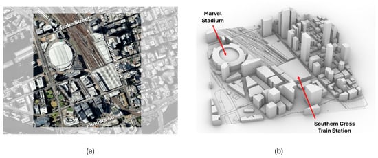 The study area is shown in Figure 2a, located at the Dockland, Melbourne CBD, featuring complex building geometry and landscapes, formed by the Marvel Stadium, Southern Cross Railway Station and the newly built high-rise apartments along Spenser Street. The 3D model created by the CADmapper online tool is shown in Figure 2b. With a diverse range of building types and urban geometry within the Dockland urban area, it offered a unique existing built environment to analyse its urban heat and outdoor thermal comfort.