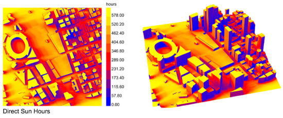 Figure 4 displays the heatmaps that illustrate the duration of direct sunlight within the study boundary. The areas with the most direct sunlight are the rooftops without any obstacles, with more than 578 h annually, mainly located to the west of the Southern Cross railway station. The area with the least direct sunlight is that of the narrow laneways across the northeast sector, due to the high-rise buildings blocking most of the sunlight reaching to the ground or lower level. The figure also shows that there is less direct sunlight in areas next to the east facing façade, for example, the open space next to the Marvel Stadium, indicating that sunset might provide the space on the western façade with more direct sunlight during the year. Note that there will never be any direct sunlight on the south facing façade due to the fact that the study site is located in the southern hemisphere.