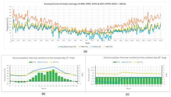 (a) Comparison of daily average of DBT, MRT, UTCI and SET using the weather data of TMYx from 2017 to 2021. (b) Hourly outdoor thermal comfort of the hottest day on 7 February; (c) hourly outdoor thermal comfort of the coldest day on 9 August.