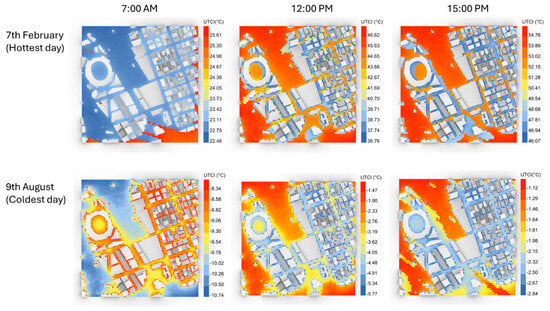In the morning of the hottest day, the UTCI difference across the study is slight, with the range from 22.48 °C to 25.61 °C, and with higher UTCI values observed in the southeast sector. However, the UTCI rose rapidly at noon, with a range between minimum 36.78 °C and maximum 46.62 °C, where the open space has higher UTCI and the narrow streets between buildings have lower UTCI. From 12 P.M. to 3 P.M., the UTCI continues to increase gradually, and reaches the maximum UTCI of 54.76 °C, with the minimum UTCI at 46.07 °C. The heatmap for the hottest day on the 7 February shows that the UTCI is evenly distributed across the area before sunrise and, once the sun reaches a certain angle, the open space heats up more quickly and more warmly than in the streets between buildings, and this can be 7–10 °C difference, as the buildings’ shade reduces the solar radiation reaching the pedestrians at ground level.