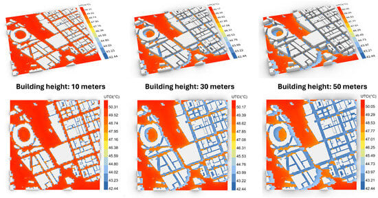 UTCI distribution at the hottest hour with different building height settings of 10 m, 30 m, and 50 m.