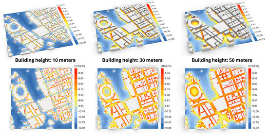 UTCI distribution at the coldest hour with different building height settings of 10 m, 30 m, and 50 m.