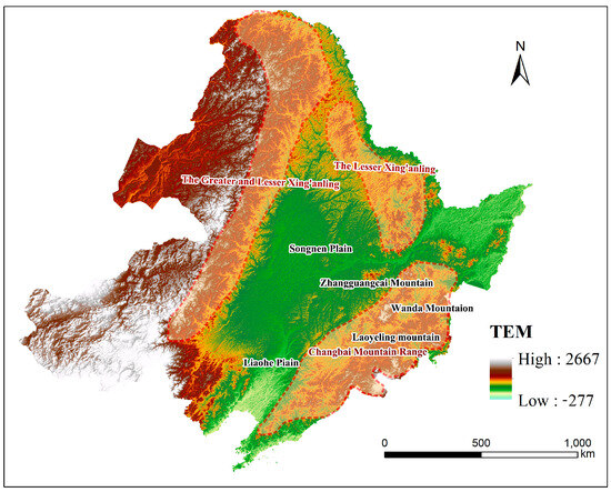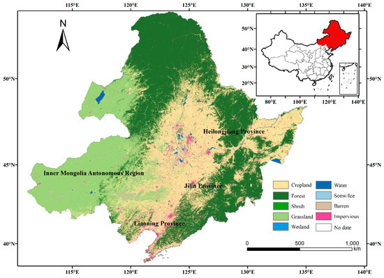 The Northeast region is located in northern China and covers the provinces of Heilongjiang, Jilin, and Liaoning, as well as the four eastern leagues of Inner Mongolia (Figure 1). It is the highest latitude region within China, with a total area of approximately 1.45 million km2. The climate there is characterized by frigid winters, temperate summers, fleeting spring and autumn seasons, a relative scarcity of thermal resources, and an annual precipitation range of 400 to 1000 mm. The region is abundant in natural resources and serves as the primary distribution belt and critical area for forests in China, encompassing 27% of the nation’s total forested land. The dominant forest types include broad-leaved forests, coniferous forests, and mixed coniferous–broadleaved forests. Additionally, it also boasts a diverse array of grassland resources, encompassing meadow grassland, typical grassland, and forest grassland. Notably, meadow grassland exhibits the highest yield of vegetation among temperate natural grasslands in China, with Hulunbeier and Horqin grasslands standing out as two of the most well-preserved exceptional grasslands across Asia and Europe. The exceptional natural resources play an indispensable role in water conservation, soil preservation, and climate warming mitigation, serving as a crucial ecological barrier in the Northeast Asian region [48].