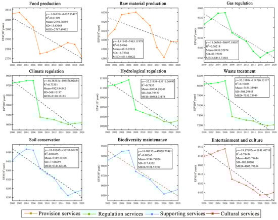 From Figure 2, it can be inferred that there were quantitative disparities in the contribution of different types of ESV. Specifically, gas regulation (CNY 837,353–857,476 million), climate regulation (CNY 900,449–980,556 million), hydrologic regulation (CNY 103,6412–113,0638 million), waste treatment (CNY 718,651–809,294 million), soil conservation (CNY 924,800–945,458 million), and biodiversity maintenance (CNY 959,841–990,833 million) contributed more to ESV. In contrast, the ESV contributions of food production (CNY 277,757–281,372 million), raw material production (CNY 458,078–463,039 billion), and entertainment and culture (CNY 446,618–479,451 million) were relatively small. In terms of temporal trends, the ESV of the nine ecological services exhibited a consistent decline throughout the study period. Notably, climate regulation, hydrologic regulation, and waste disposal demonstrated substantial decreases in ESV. Conversely, ESVs for food production and raw material production remained relatively stable.