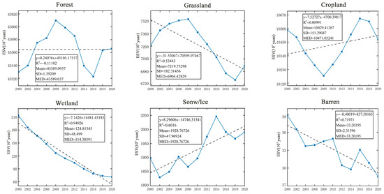Nine subcategories in provision services, regulatory services, supporting services, and cultural services were quantified, and fitting methodology was employed to identify trends in the Northeast region from 2000 to 2020 (Figure 2). In this case, the solid lines in orange, green, blue, and red represented the respective monetary values associated with provisioning, regulating, supporting, and cultural services. Additionally, the black dashed line depicted a linearly fitted trend. The ESVs under six different land covers were processed in the same way, and the results were illustrated in Figure 3. The solid blue line showed the annual change in ESV for different land uses, and the dashed black line represented the linearly fitted trend.