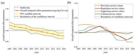 As depicted in Figure 4, a clear overall downward trend in ESV was evident during the period of 2000–2020, with a larger number of districts and counties experiencing a decrease rather than an increase in ESV. The overall time effect parameter (exp (b0t* + vt)) further confirmed this declining trend by revealing the deviation of ESV from the multi-year average on a yearly basis (Figure 4a). However, it should be noted that this decline had not been consistently sustained, as there had been intermittent periods of slow growth in ESV observed in 2002, 2006, and 2008. Additionally, the downward trend exhibited a zigzag pattern based on the analysis of the 95% confidence intervals (Figure 4b), with regulatory services fluctuating the most and cultural services the least.