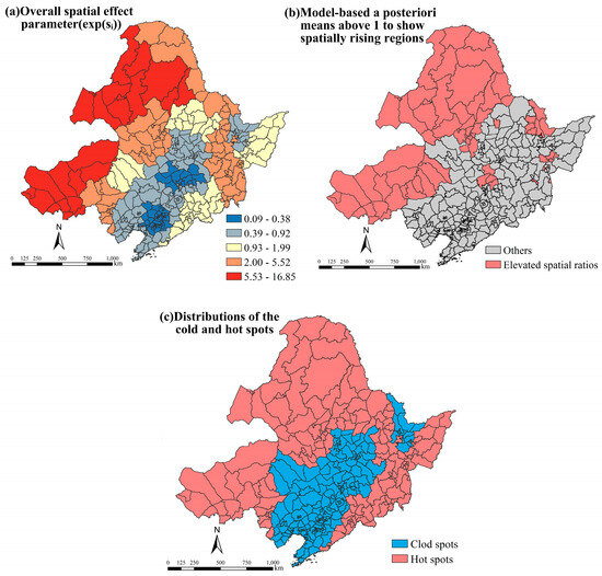 The overall spatial effect parameter exp (Si) was computed in this study to quantify the magnitude of ESV in region i relative to the average level α in the study area during the observation period. The hot and cold spots of the ESV spatial distribution are determined based on the value of P (exp(si) > 1|data). Regions with P(exp(si) > 1|data) > 0.8, were identified as hot spots, while regions with P(exp(si) > 1|data) < 0.2 were classified as cold spots; regions with P(exp(si) > 1|data) between 0.2 and 0.8 were categorized as warm spots [59].