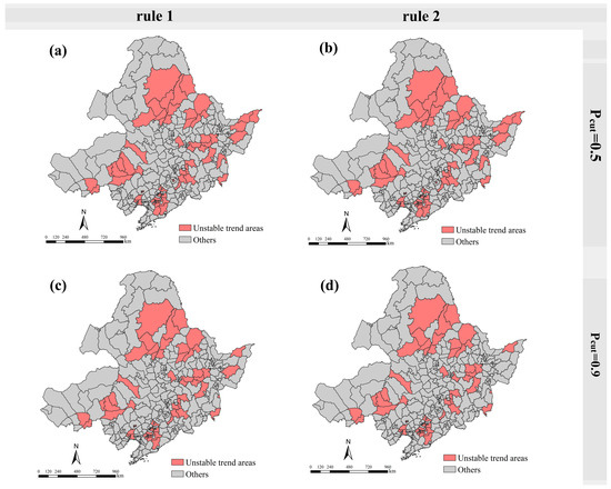 Based on Equation (14) and related studies [47], we rationalize the assignment of the threshold probability Pcut. Specifically, a smaller value of 0.5 and a larger one of 0.9 were rationally chosen to identify unstable regions of spatio-temporal fluctuations of ESV in the study area. The corresponding results were illustrated in Figure 7.