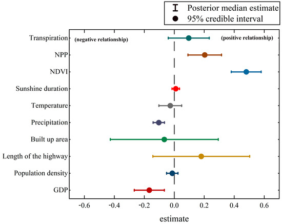 In order to comprehensively analyze the impact of drivers on the spatio-temporal fluctuations of ESV, both anthropogenic and natural drivers were incorporated as covariates in this spatio-temporal hierarchical model for each region. Figure 8 presented the estimated effects of these ten covariates. The Bayesian spatio-temporal hierarchical model yielded posterior median values for the 10 influences. The Gelman–Rubin statistical parameters of these influences were all close to 1, indicating excellent convergence. Further analysis revealed a negative correlation between GDP, population density, floor area, annual precipitation and average annual temperature with ESV; conversely, length of the highway, sunshine duration, NDVI, NPP and transpiration exhibited a positive correlation with ESV. Specifically, an increase in GDP, population density, floor space, annual precipitation, and average annual temperature was associated with a decrease in ESV by 0.16 (95% CI: −0.21, −0.13), 0.01 (95% CI: −0.03, 0.00), 0.07 (95% CI: −0.21, 0.88), 0.1 (95% CI: −0.12, −0.09) and 0.02 (95% CI: −0.06, 0.00) units. Conversely, for every increase in highway length, sunshine hours, NDVI, NPP, and transpiration, the probability of ESV growth increased by 0.18 (95% CI: 0.05, 031), 0.01 (95% CI: 0.00, 0.02), 0.48 (95% CI: 0.44, 0.52), 0.2 (95% CI: 0.16, 0.25) and 0.07 (95% CI: 0.06, 0.16) units.