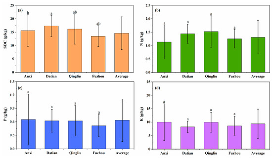 The content of averaged (a) SOC, (b) N, (c) P, and (d) K of tea plantations in different counties. The black vertical bars represent the standard deviation of the sampling data. The letters on the top represent the statistical difference in the four regions; the significance level is 0.05.