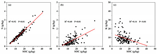 The relationship between SOC and (a) N, (b) P, and (c) K in tea plantations.